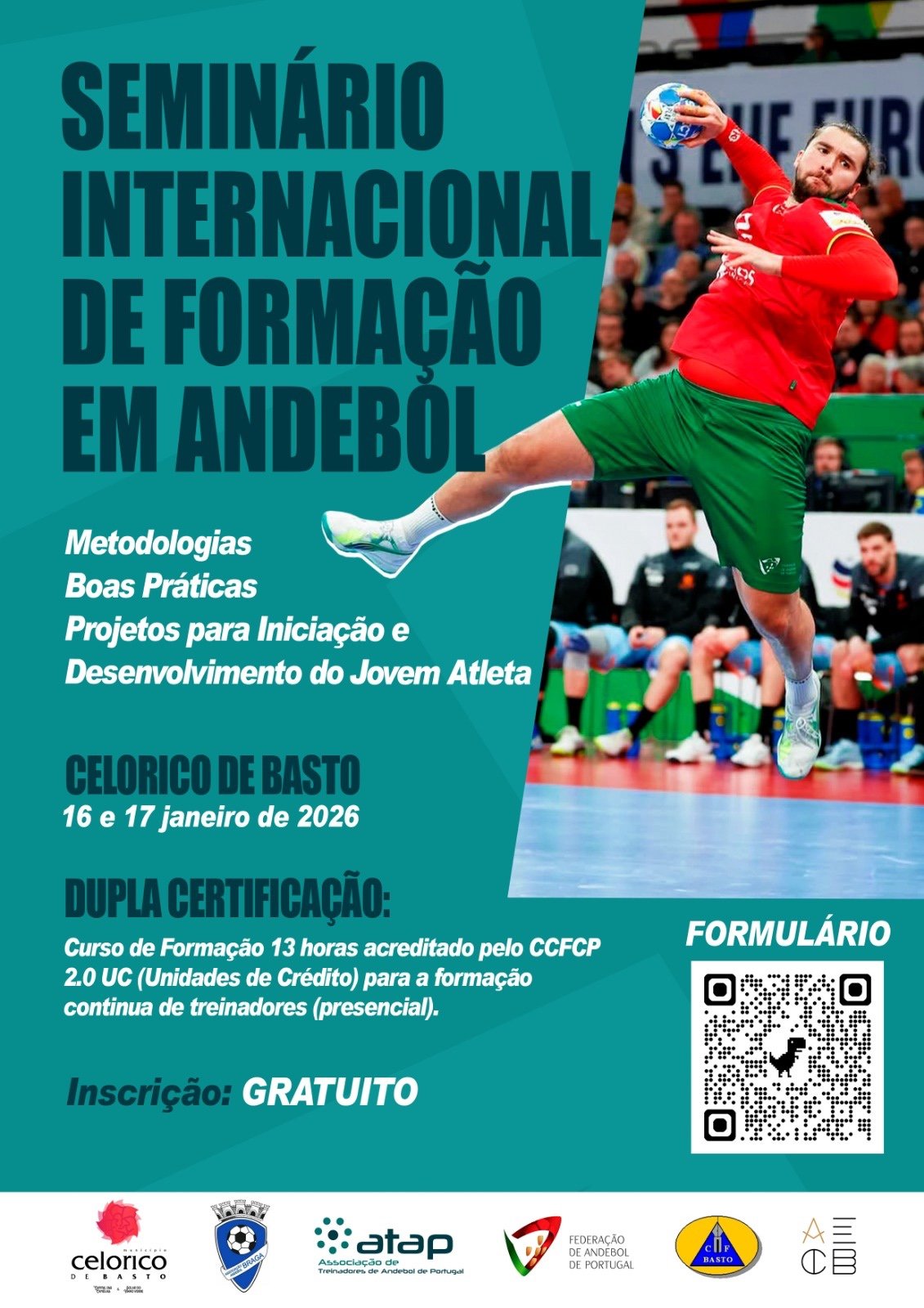 A participação no seminário é gratuita e oferece 13 horas de formação acreditada para docentes de Educação Física e 2,0 Unidades de Crédito (UC) para revalidação do Título de Treinador de Andebol.